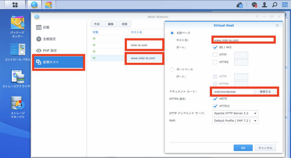 (Virtual Server設定で、「https://www.miki-ie.com」アクセスを設定した公開フォルダ(「/volume1/web/wordpress」など)とマッピング。)