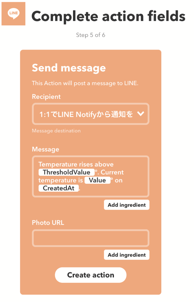 $text = mb_substr($text,0,mb_strpos($text,'#',0,"UTF-8"),"UTF-8"); アクション1 LINE送信のアクションを設定します。すでに、他ユースケースなどでIFTTT側にLINE送信のレシピを導入されている方は、アクション2の定義に進んで下さい。