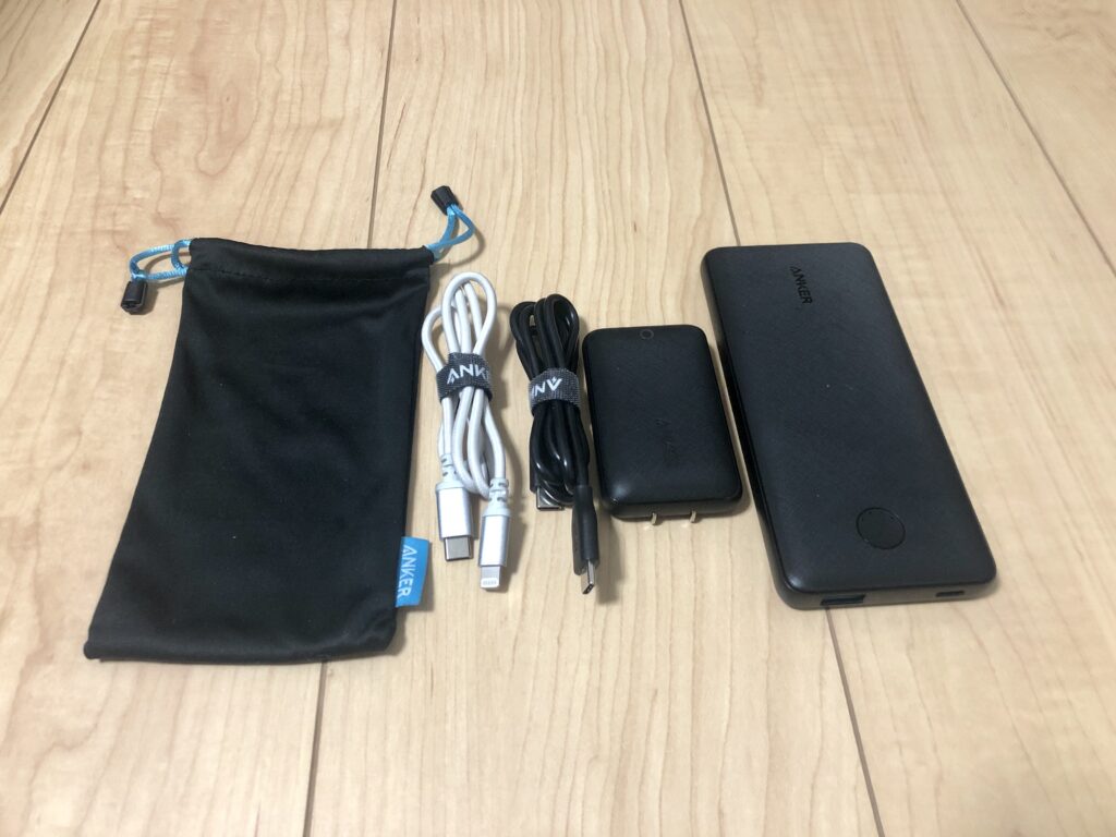 現在のモバイルバッテリーと、モバイル充電器とケーブルです。