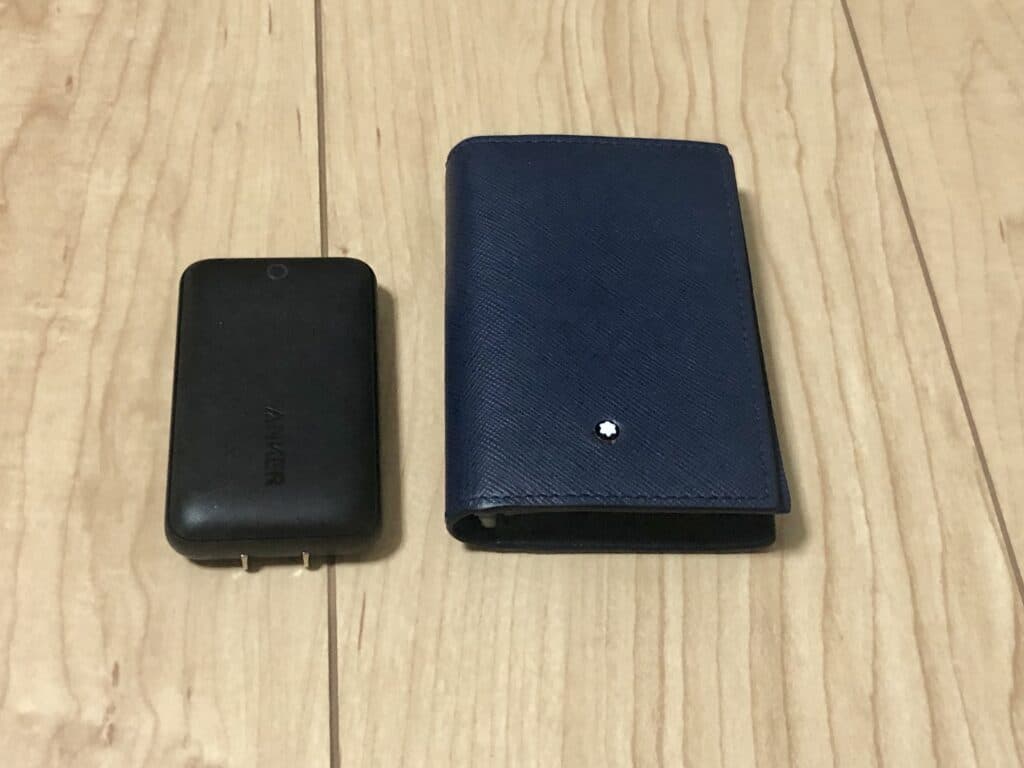 AnkerPowerPort Atom III Slimの小ささは、感動レベルです。薄手のカバンなどにも余裕で入ります。参考に名刺入れと並べた際の充電器の写真を載せておきます。