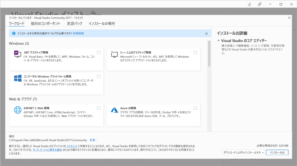 Microsoft Visual StudioのCommunity版をダウンロードし、インストールします。2017年版のVSインストールを推奨するWEBページが多かったです。コンフィグ時にエラーが出たので、私も2017版をインストールしました。